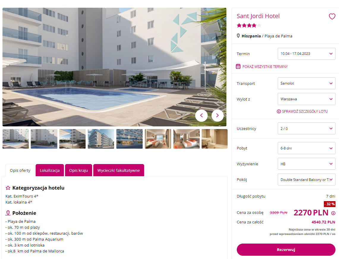 Do Hiszpanii udasz się w terminie 13 – 20 kwietnia. Czeka cię bezpośredni lot na Majorkę, a jako miejsce wylotu tym razem wybrano lotnisko w Warszawie.