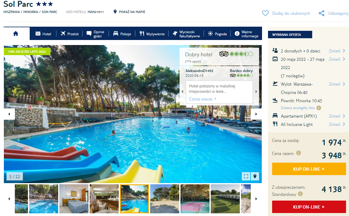Na wczasy wybierzecie się w terminie 20–27 maja. 3* hotel Sol Parc, w którym spędzicie tydzień, położony jest tuż nad brzegiem Morza Śródziemnego, 300 metrów od urokliwej plaży. W kompleksie do waszej dyspozycji będą klimatyzowane pokoje z balkonem, baseny (w tym jeden ze zjeżdżalniami) oraz bogate zaplecze sportowe. Obiekt posiada bardzo dobre opinie dotychczasowych gości.