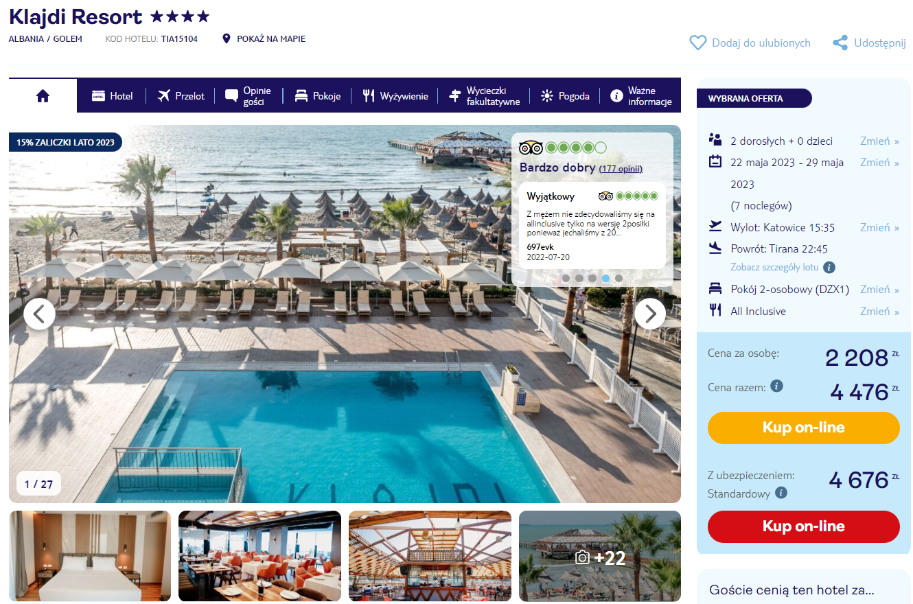 Oferta zawiera wyżywienie w formule all inclusive, podstawowe ubezpieczenie oraz bagaż rejestrowany. Transfery lotniskowe można dokupić za 60 PLN w obie strony.