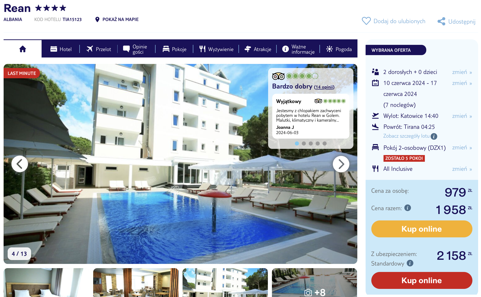 W cenę pakietu wliczony jest bagaż rejestrowany, podstawowe ubezpieczenie, opieka rezydenta oraz all inclusive. Transfery lotniskowe są dodatkowo płatne i możesz dokupić je za 130 PLN.