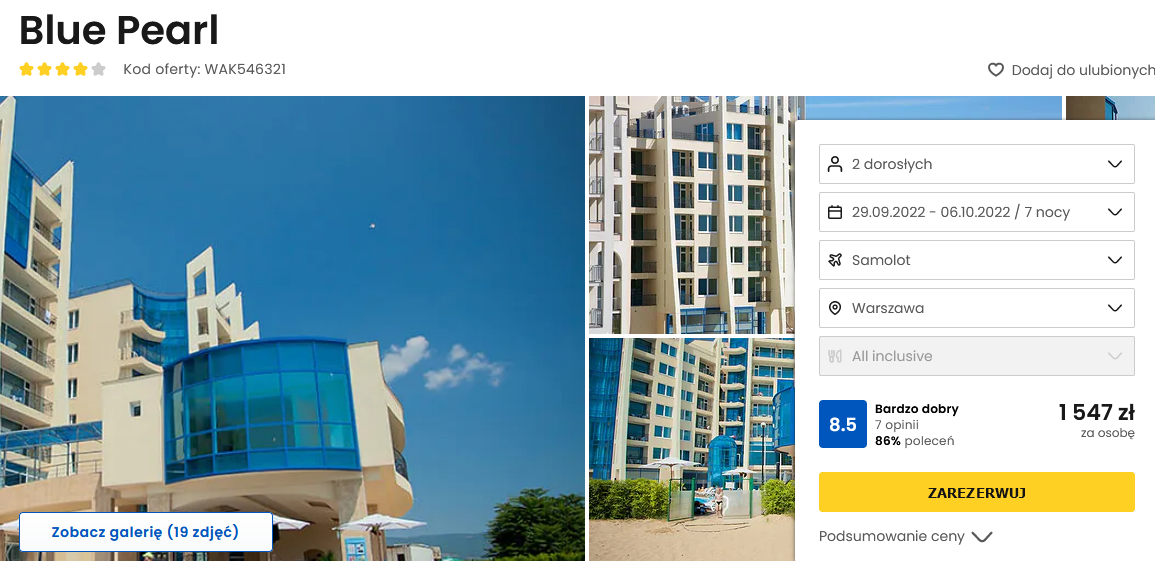 Na miejscu będziecie zakwaterowani w 4* hotelu Blue Pearl. Do waszej dyspozycji będzie restauracja, bary, baseny oraz komfortowe wyżywienie w formule all inclusive. Ponadto będziecie mogli korzystać ze strefy spa. Obiekt posiada dobre opinie dotychczasowych gości. Co więcej, plaża znajduje się w sąsiedztwie ośrodka.