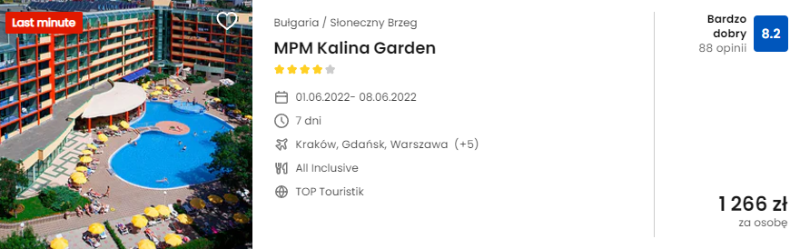 Do Burgas udacie się w terminie 1-8 czerwca. Do Bułgarii polecicie bezpośrednio z Warszawy, Katowic, Gdańska, Krakowa, Lublina, Wrocławia, Rzeszowa lub Poznania. Na miejscu będziecie zakwaterowani w 4* hotelu MPM Kalina Garden, który położony jest w pobliżu piaszczystej plaży. Dla gości udostępniono m.in. basen, zjeżdżalnie, jacuzzi, Wi-Fi oraz klimatyzowane pokoje. Wypoczynkowi będą sprzyjać codzienne posiłki w ramach all inclusive.