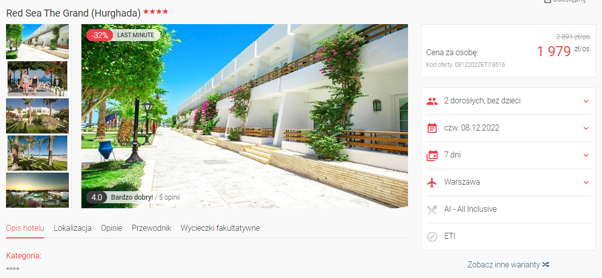 Tym razem zatrzymasz się w świetnym 4* hotel Red Sea The Grand. Do dyspozycji gości zostanie oddany m.in.: basen zewnętrzny, ogród z palmami, taras słoneczny i bogate zaplecze sportowe. Na miejscu spodziewaj się obsługi na najwyższym poziomie, mnóstwa atrakcji dla odwiedzających oraz zróżnicowanej oferty wyżywienia w formule all inclusive.
