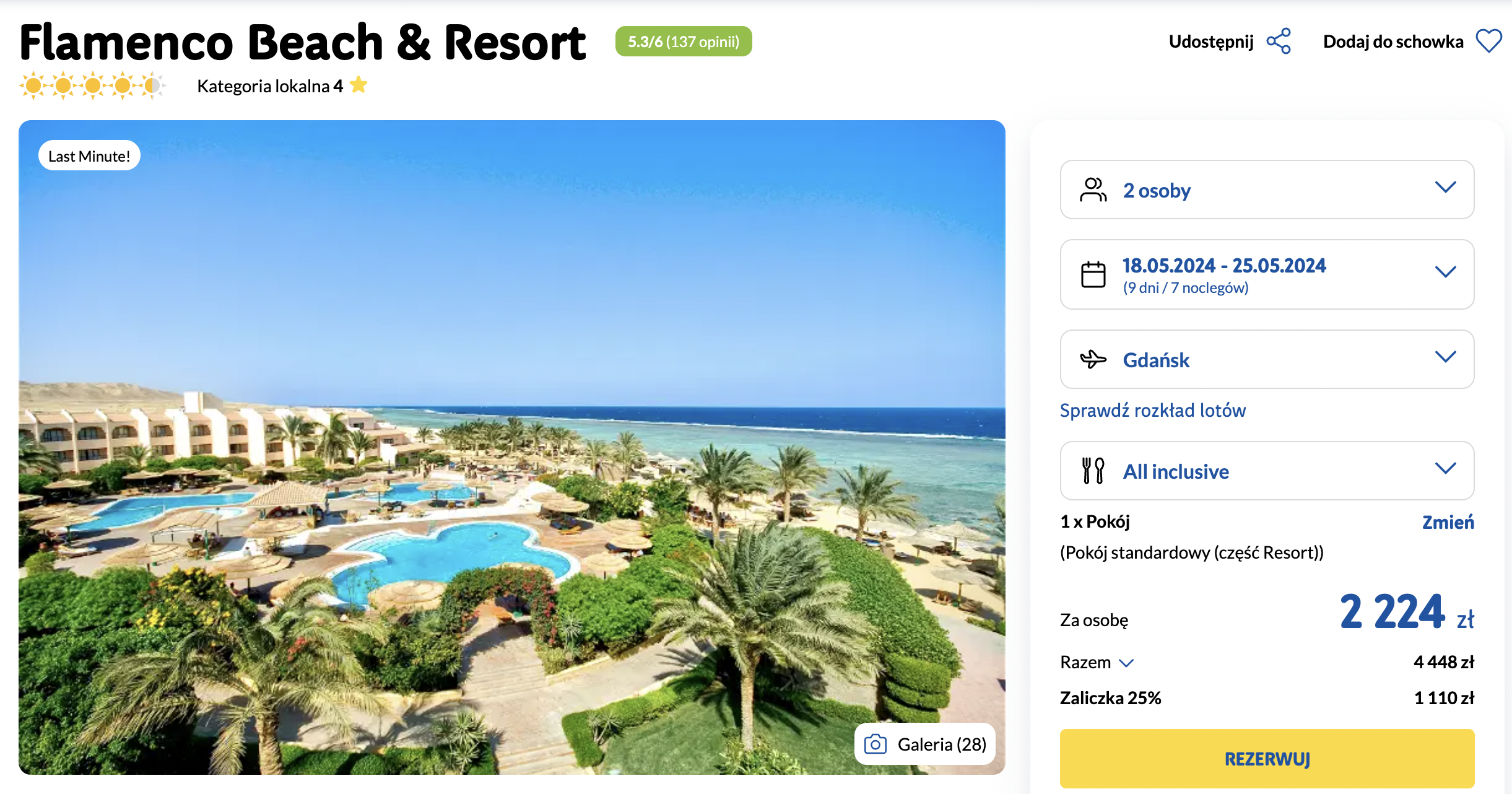 W Egipcie będziesz zakwaterowany w bardzo dobrze ocenianym 4* hotelu Flamenco Beach & Resort. Do twojej dyspozycji będą 3 baseny, taras słoneczny, duży zielony ogród, bogate zaplecze sportowe (aerobik, gimnastyka w wodzie, siatkówka w wodzie, rzutki, boccia, tenis stołowy, kort tenisowy oraz siłownia) i strefa spa. Plaża położona jest bezpośrednio przy obiekcie.