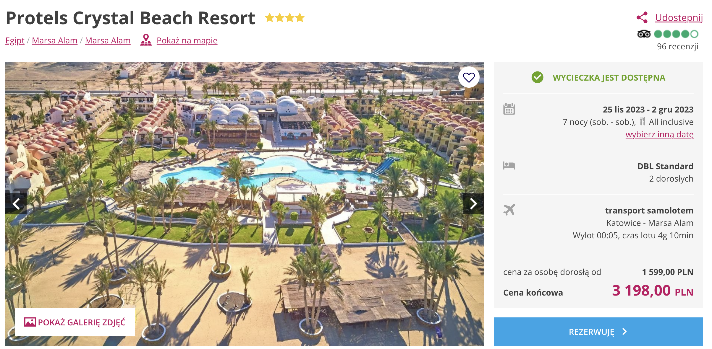 Do Egiptu udasz się w dniach 25 listopada -2 grudnia. Na urlop polecisz z wliczonym bagażem rejestrowanym z Katowic. W cenie pakietu otrzymasz wyżywienie w formule all inclusive, opiekę polskiego rezydenta, transfery lotniskowe i ubezpieczenie.