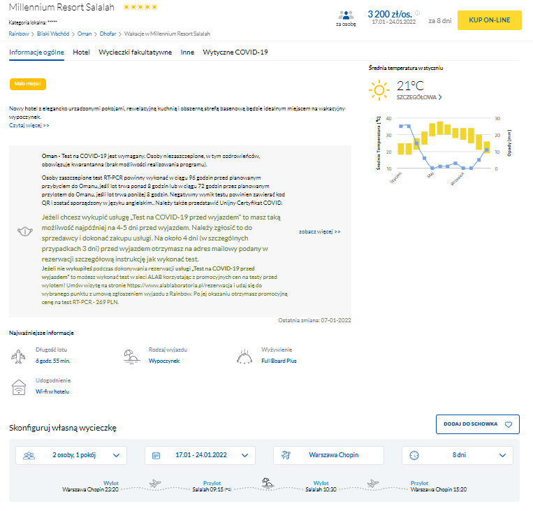W Omanie zatrzymacie się w luksusowym 5* Millenium Resort Salalah, zlokalizowanym blisko 10 km od serca miasta Salala. Dla gości udostępniono m.in. 3 tematyczne restauracje, kawiarnię, siłownię, spa oraz dwa baseny z leżakami i parasolami. Jeżeli chodzi o plażę – to najbliższa oddalona jest o 4 km od hotelu. Nie martwcie się jednak na zapas – w obie strony kursują do niej bezpłatne busy. Wszystkie pokoje są nowocześnie urządzone i posiadają prywatne łazienki z bezpłatnym zestawem kosmetyków, klimatyzację, mini bar oraz dostęp do Wi-Fi.