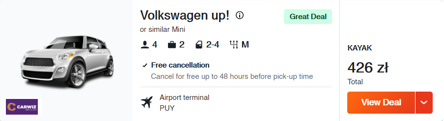 Chcecie zobaczyć więcej? Poruszanie się po Chorwacji ułatwi wam wypożyczony samochód. W przypadku tej podróży polecam wam auto marki Volkswagen (model up! lub inne auto zbliżonej klasy).