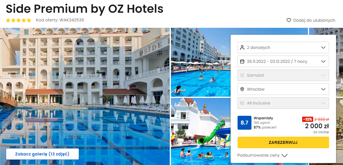 Urlop na Riwierze Tureckiej zaplanowano w terminie 26 listopada – 3 grudnia. Czeka cię bezpośredni lot do Antalyi, a jako miejsce wyloty możesz wybrać Warszawę, Wrocław, Gdańsk, Poznań oraz Katowice. W cenę pakietu wliczono podróż z bagażem rejestrowanym.