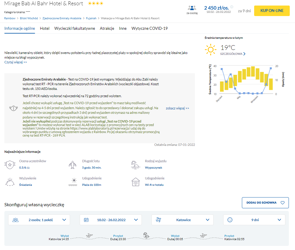 Skorzystajcie z obniżki cen w biurze podróży Rainbow i zarezerwujcie wczasy w 4* hotelu Mirage Bab Al Bahr Hotel & Resort, który jest położony w północnej części emiratu Fudżajra nad Zatoką Omańską, bezpośrednio przy prywatnej, piaszczystej plaży, w sąsiedztwie gór Hajar. Na terenie obiektu znajduje się basen zewnętrzny oraz oddzielny brodzik dla dzieci z wodnym placem zabaw i taras słoneczny. Dla gości udostępniono komfortowe, klimatyzowane pokoje wyposażone w prywatne łazienki.