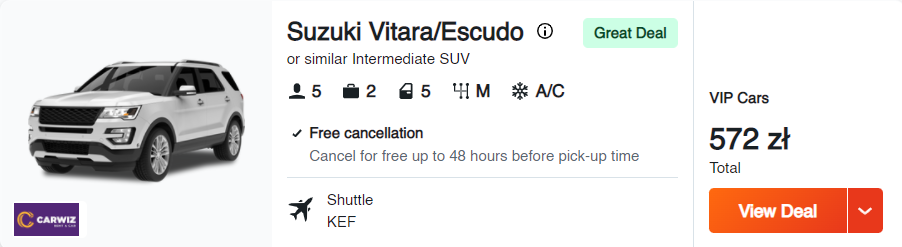 Islandię najprościej będzie wam zwiedzać wypożyczonym samochodem. W przypadku tej podróży wybrałam dla was auto marki Suzuki (model Vitara/Escudo lub zbliżonej klasy).