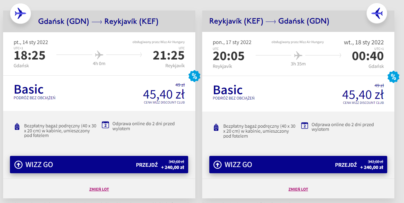 Na Islandię polecicie na pokładzie samolotu linii lotniczej Wizz Air z lotniska w Gdańsku. Na wycieczkę wybierzecie się w terminie 14 – 17 stycznia (piątek – poniedziałek). Pamiętajcie, że najtaniej bilety kupią członkowie Wizz Discount Club – pozostali chętni zapłacą nieco więcej. W cenę wliczony jest wyłącznie mały bagaż podręczny. Przeczytajcie nasze wskazówki, jak się spakować, a nie powinno to stanowić problemu.