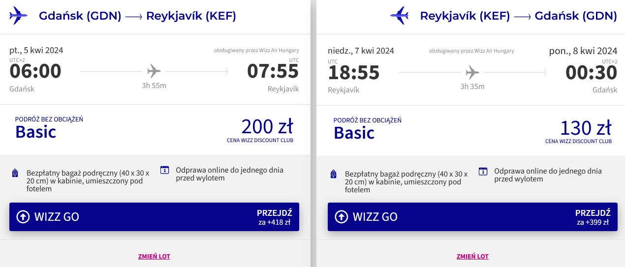 Do Reykjavíku udasz się w terminie 5-7 kwietnia (piątek-niedziela) z lotniska im. Lecha Wałęsy w Gdańsku na pokładach samolotów linii lotniczej Wizz Air. Bez dodatkowych kosztów możesz zabrać ze sobą mały bagaż podręczny.