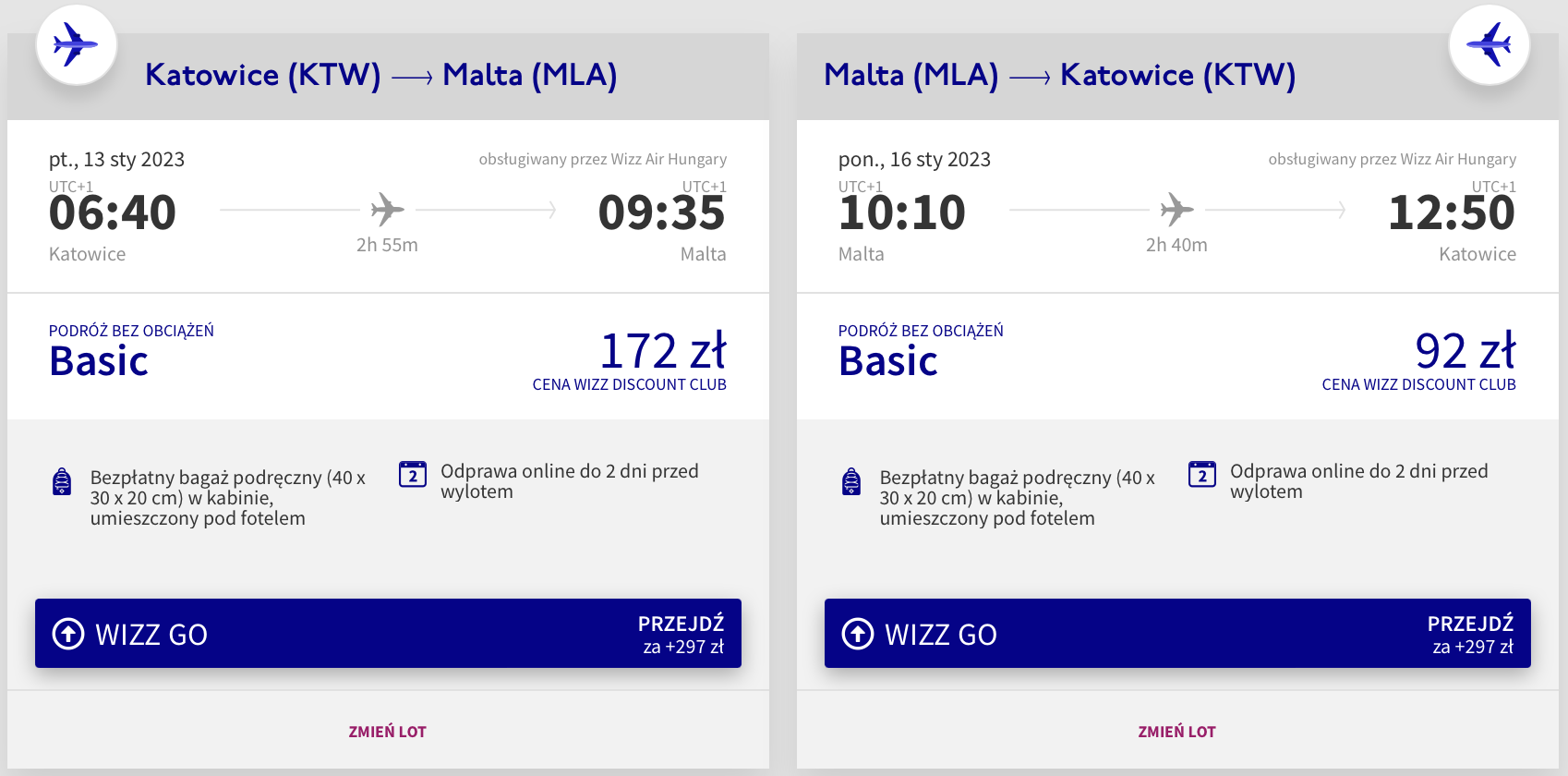 Na Maltę udacie się w terminie 13-16 stycznia (piątek-poniedziałek) z lotniska w Pyrzowicach. W obie strony polecicie bezpośrednio na pokładach samolotów linii Wizz Air. Bilety w najniższej cenie dostępne są dla osób z Wizz Discount Club. Chętni na loty bez WDC zapłacą więcej.