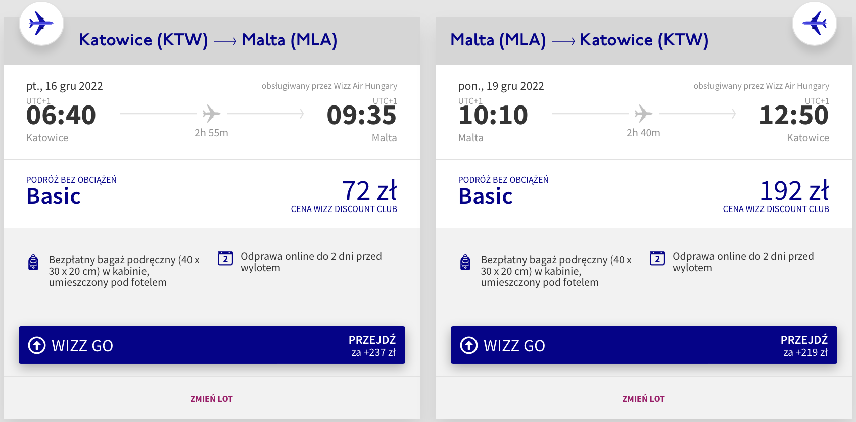 Na Maltę polecicie w dniach 16-19 grudnia (piątek-poniedziałek) z lotniska w Pyrzowicach. W obie strony podróżować będziecie bezpośrednio na pokładach samolotów linii Wizz Air. Bilety w najniższej cenie dostępne są dla osób z Wizz Discount Club. Chętni na loty bez WDC zapłacą więcej.