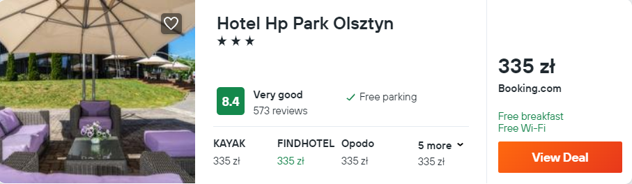 W stolicy województw warmińsko-mazurskiego proponuję wam noclegi ze śniadaniami w 3* hotelu Hp Park Olsztyn. Jest on położony w sąsiedztwie jezior: Kortowskiego oraz Starodworskiego. Na miejscu będziecie mogli korzystać z bezpłatnego parkingu oraz dostępu do sieci WiFi.