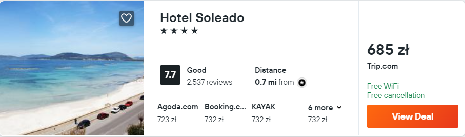 W Alghero zakwaterowani będziecie w 4* hotelu Soleado, który położony jest tuż przy miejskiej plaży. Z lotniska w okolice miejsca noclegowego dojedziecie autobusem linii 9373 (ALPHA) lub wypożyczonym samochodem – szczegóły poniżej.