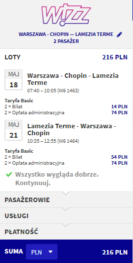 - Loty na trasie Warszawa – Lamezia-Terme za 216 PLN/2 osoby (108 PLN/osoba)