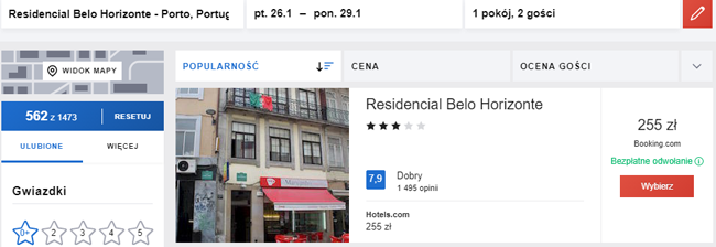 W Porto polecam zatrzymać się w Residencial Belo Horizonte od 255 PLN/2 osoby/3 noce. W tej cenie dostępny jest jeden pokój „economy”, kolejne „standard” dostępne są za 319 PLN/2 osoby/3 noce.