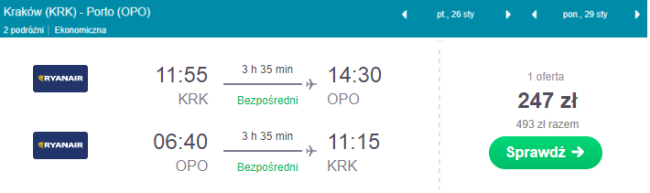 - Loty z Krakowa do Porto (26 – 29 stycznia) za 494 PLN/2 osoby (247 PLN/osoba)