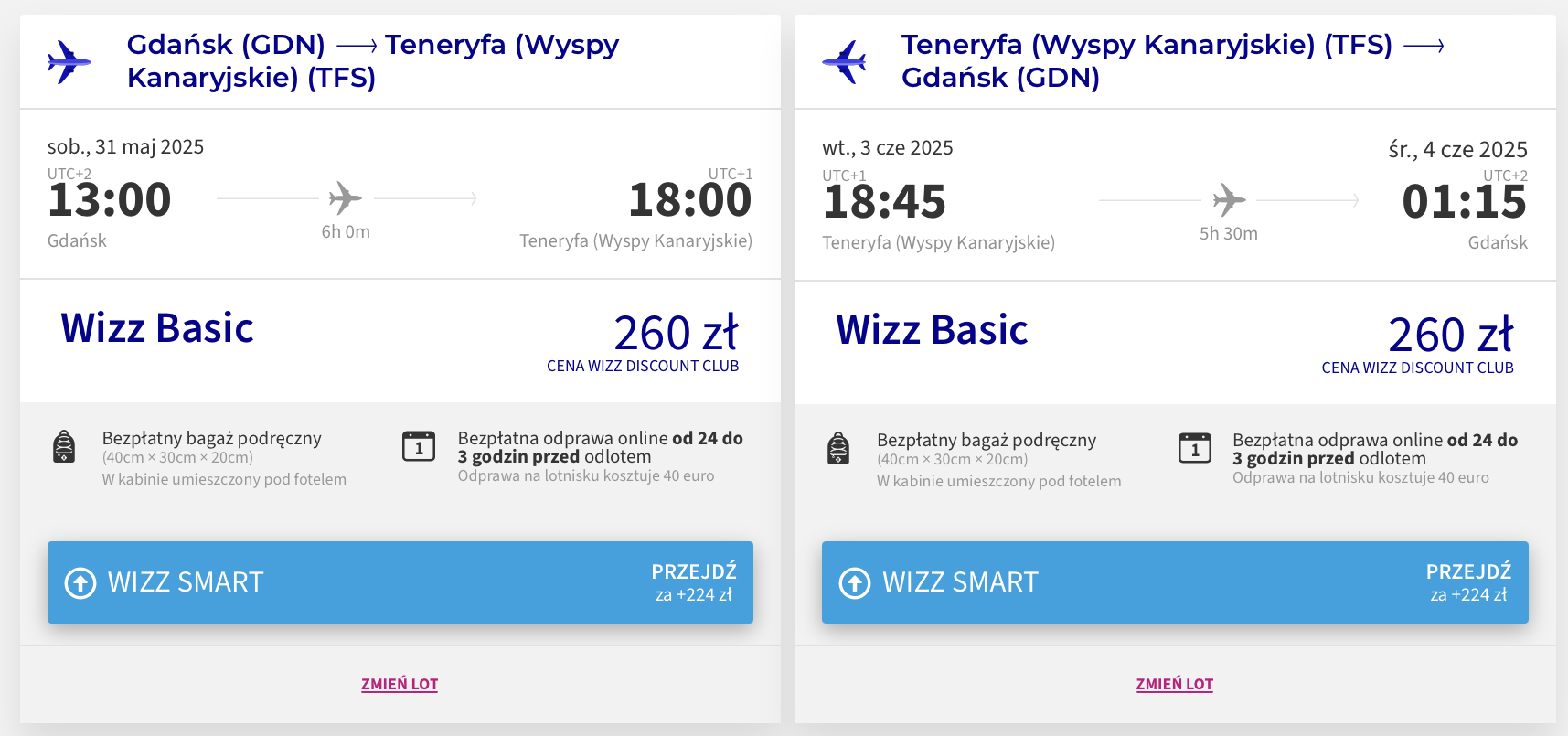 Do Hiszpanii wybierzesz się w terminie 31 maja – 3 czerwca (sobota-wtorek) z lotniska w Gdańsku. Na Teneryfę polecisz z bagażem podręcznym, bezpośrednio linią Wizz Air. Bilety w najniższej cenie dostępne są dla członków Wizz Discount Club. Chętni na loty bez WDC zapłacą więcej.