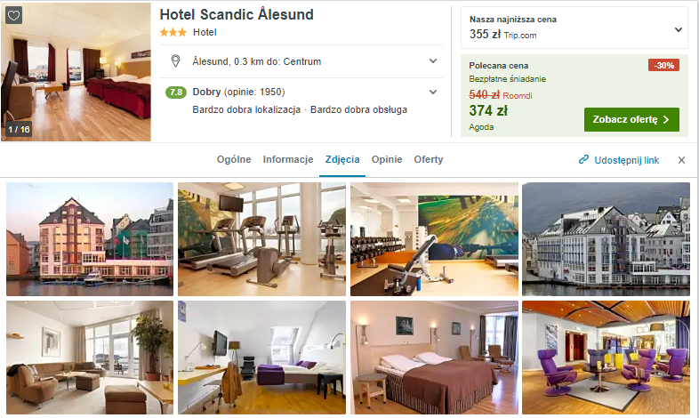 W Alesund proponuję wam zakwaterowanie w bardzo dobrze ocenianym 4* hotelu Scandic. Jego atutami jest położenie w centrum miasta, przy morzu. Otrzymacie także smaczne śniadanie, wliczona w cenę noclegu.