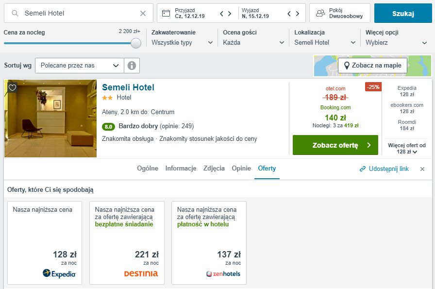 W Grecji proponuję wam noclegi w Semeli Hotel, który leży w centrum Aten. Każdy pokój jest klimatyzowany i wyposażony w telewizory LCD z dostępem do kanałów satelitarnych oraz łazienkę. Wybierając z listy pośrednika Expedia za 3 noce zapłacicie 386 PLN/2 osoby.