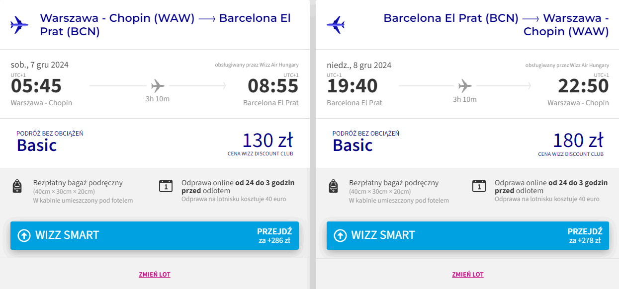 Do Barcelony wylecisz w sobotę (7 grudnia) o godzinie 5:45 z warszawskiego lotniska im. Fryderyka Chopina. Do stolicy Polski wrócisz w niedzielę (8 grudnia), a wylot zaplanowany jest na 19:40. W obie strony polecisz linią Wizz Air z wliczonym bagażem podręcznym. Bilety w najniższej cenie dostępne są dla członków Wizz Discount Club. Chętni na loty bez WDC zapłacą więcej.