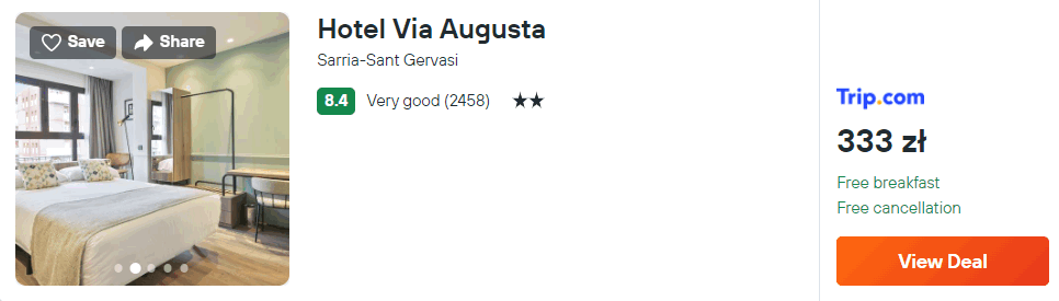 Na miejscu zatrzymasz się w hotelu Via Augusta, który znajduje się nieopodal stacji metra Fontana oraz w odległości nieco ponad 2 km od kościoła Sagrada Familia. Z lotniska w okolice miejsca noclegowego dojedziesz komunikacją publiczną.