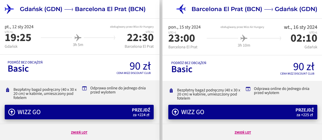 Do Barcelony udasz się w terminie 12-15 stycznia (piątek – poniedziałek) z portu lotniczego im. Lecha Wałęsy w Gdańsku. Czekają cię loty na pokładach samolotów linii lotniczej Wizz Air. Bez dodatkowych kosztów będziesz mógł zabrać ze sobą mały bagaż podręczny.
