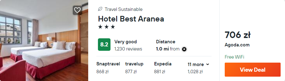 W stolicy Katalonii rekomenduję wam noclegi w 3* hotelu Best Aranea, który znajduje się w odległości 5 minut spacerem od kościoła Sagrada Familia. Wszystkie pokoje zostały wyposażone w klimatyzację oraz telewizor LCD. W łazience jest wanna z prysznicem i suszarka do włosów. Na terenie całego obiektu będziecie mieć zapewniony dostęp do sieci WiFi.