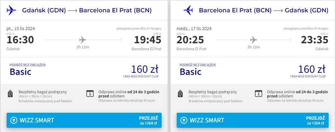 Do stolicy Katalonii udasz się z Gdańska w terminie 15-17 listopada. W obie strony polecisz linią Wizz Air z wliczonym bagażem podręcznym. Bilety w najniższej cenie dostępne są dla członków Wizz Discount Club. Chętni na loty bez WDC zapłacą więcej.