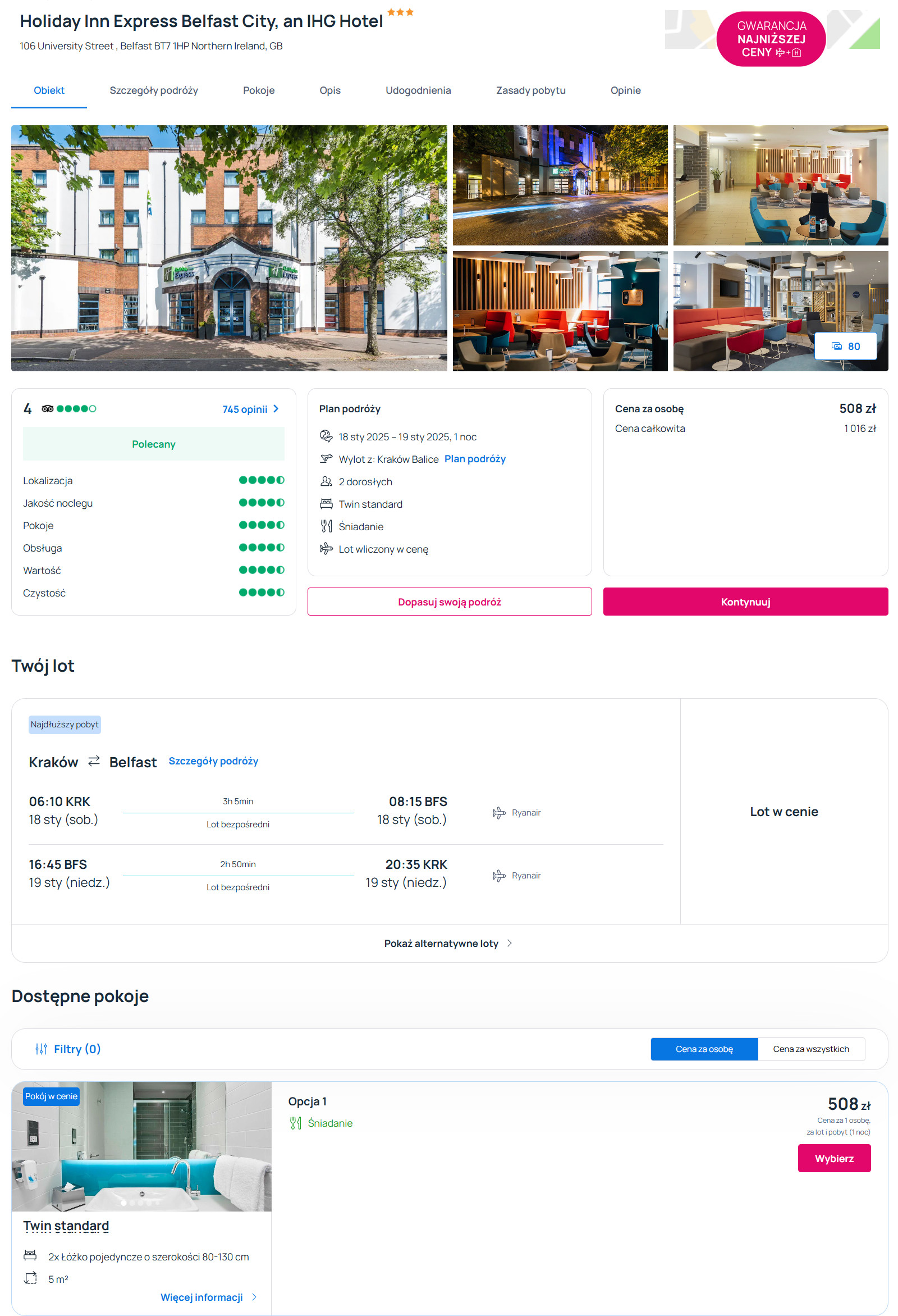 Do Irlandii Północnej udasz się w sobotę (18 stycznia) z portu lotniczego Kraków-Balice o godzinie 6:10. W drogę powrotną do Polski wyruszysz w niedzielę (19 stycznia), a odlot zaplanowano na godzinę 16:45. W obie strony polecisz bezpośrednio linią Ryanair z bagażem podręcznym.