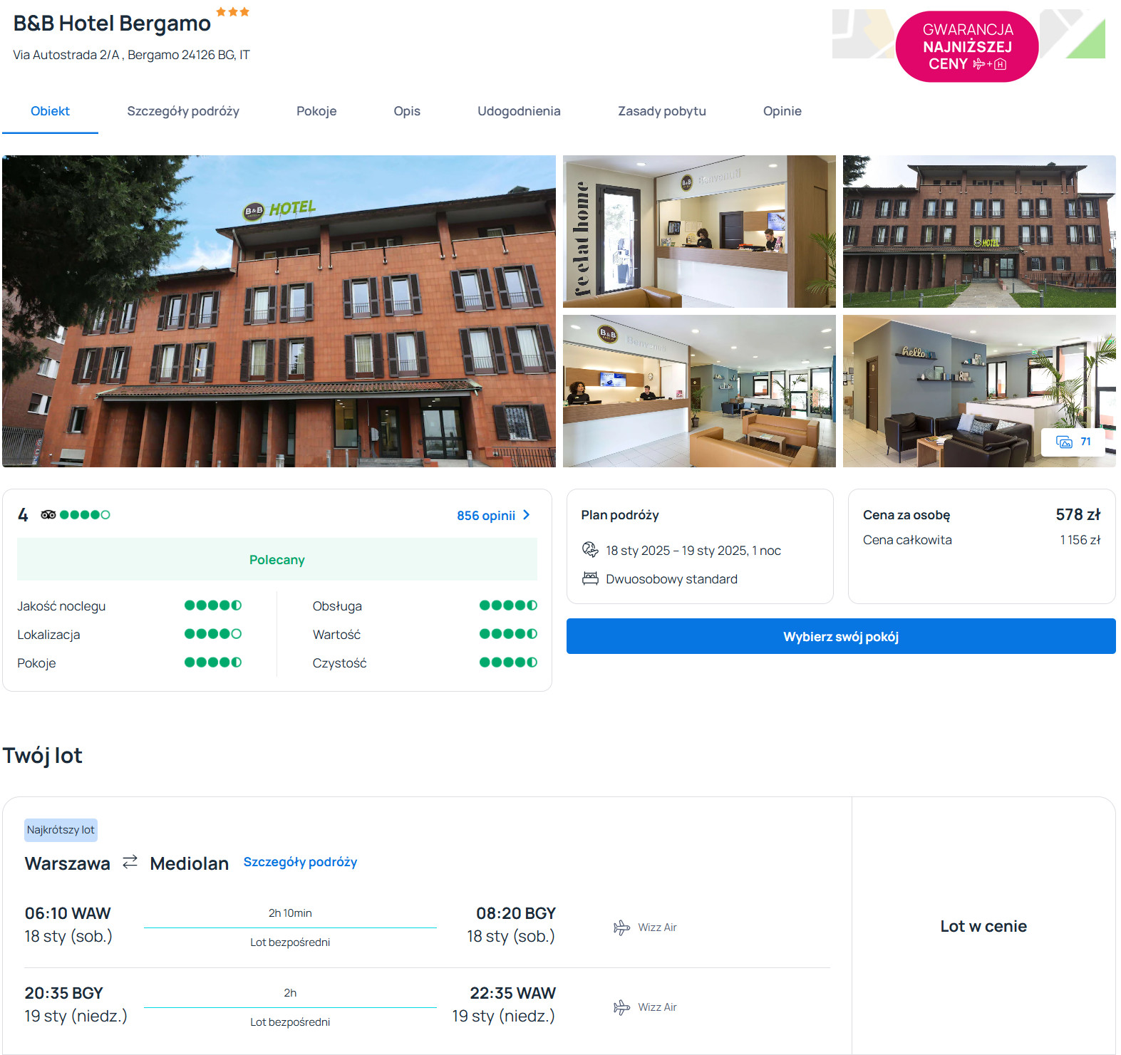 Do Bergamo wylecisz z Warszawy w sobotę (18 stycznia) o godzinie 6:10. W drogę powrotną do stolicy Polski wyruszysz w niedzielę (19 stycznia), a wylot zaplanowano na godzinę 20:35. W obie strony podróżować będziesz bezpośrednio linią Wizz Air z bagażem podręcznym.