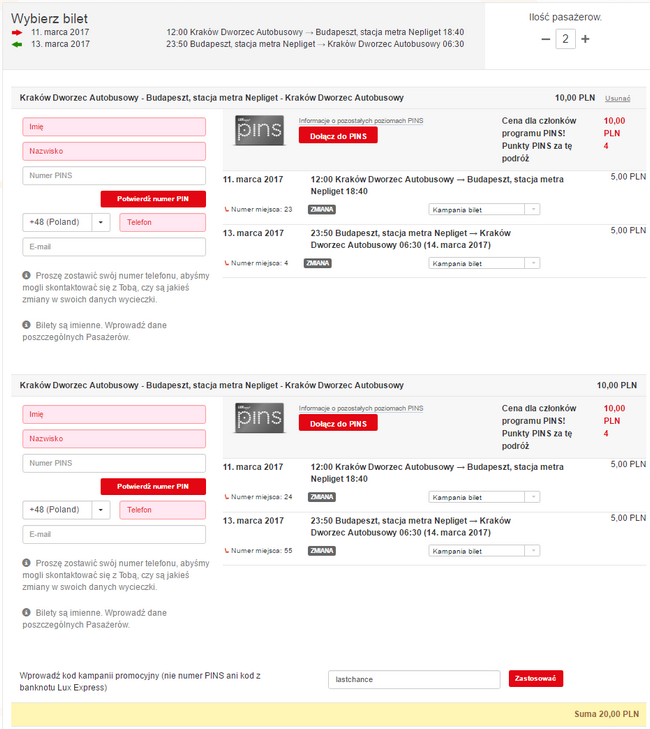 Przykładowa rezerwacja przejazdów dla 2 osób: