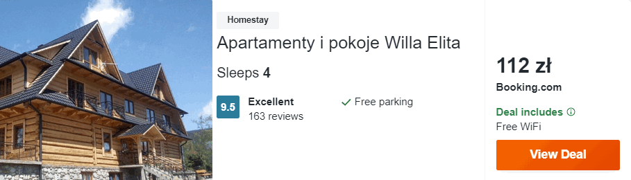 Pierwsza z moich propozycji i zarazem najtańsza, to Willa Elita w Kościelisku. Chata praktycznie w całości wykonana jest z drewna, co idealnie oddaje podhalański klimat już po przekroczeniu jego progu.
