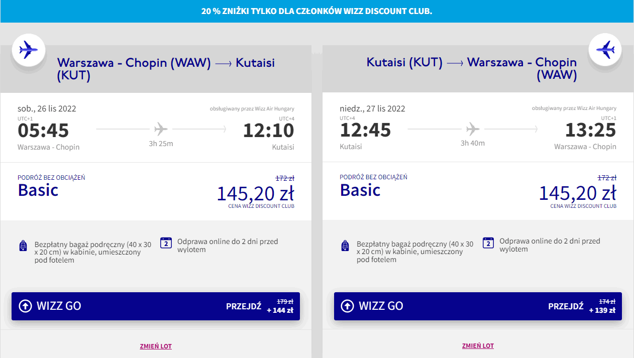 Na wycieczkę udacie się w okresie 26-27 listopada (sobota-niedziela) ze stołecznego lotniska im. Chopina. W obie strony polecicie na pokładach samolotów linii Wizz Air. Bilety w najniższej cenie dostępne są dla osób z Wizz Discount Club. Chętni na loty bez WDC zapłacą nieco więcej.