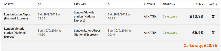 easyBus | Londyn Luton 08:55 – Londyn Victoria 10:15 | 20.96 GBP (ok. 102 PLN) / 2 osoby | 29 września