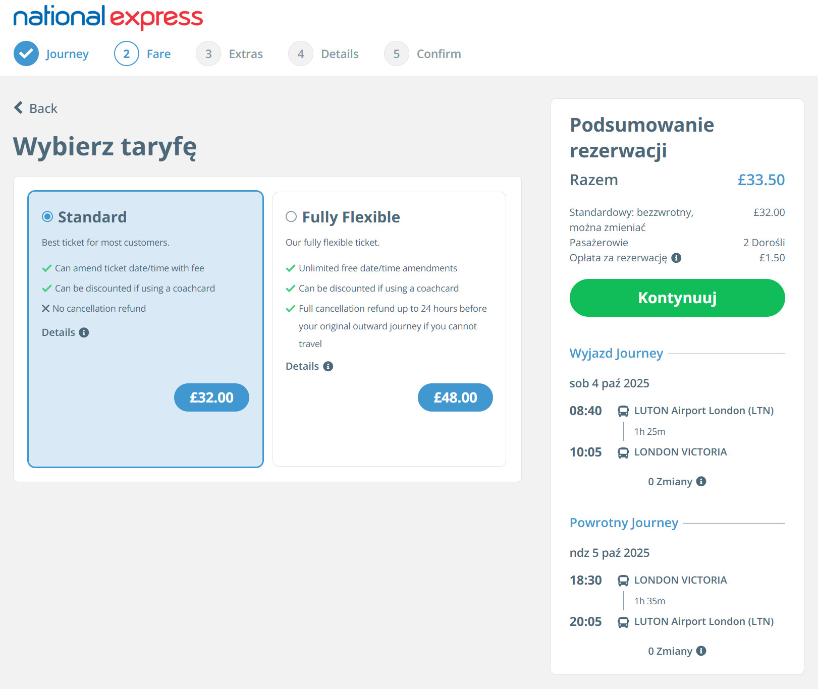 Jedną z najtańszych opcji dojazdu z lotniska Luton do centrum Londynu (dworzec Victoria), jest przejazd autokarem firmy National Express Coaches. Za kurs w dwie strony zapłacisz 33,5 GBP/2 osoby (ok. 165 PLN). Bilety zarezerwujesz na stronie internetowej przewoźnika.