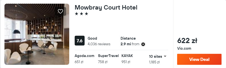 W Londynie rekomenduję ci noclegi w 3* hotelu Mowbray Court. Każdy pokoju jest ogrzewany i wyposażony został w telewizor LCD oraz czajnik elektryczny. W łazience jest prysznic oraz suszarka do włosów. Na terenie całego obiektu będziesz mieć zapewniony dostęp do sieci WiFi.