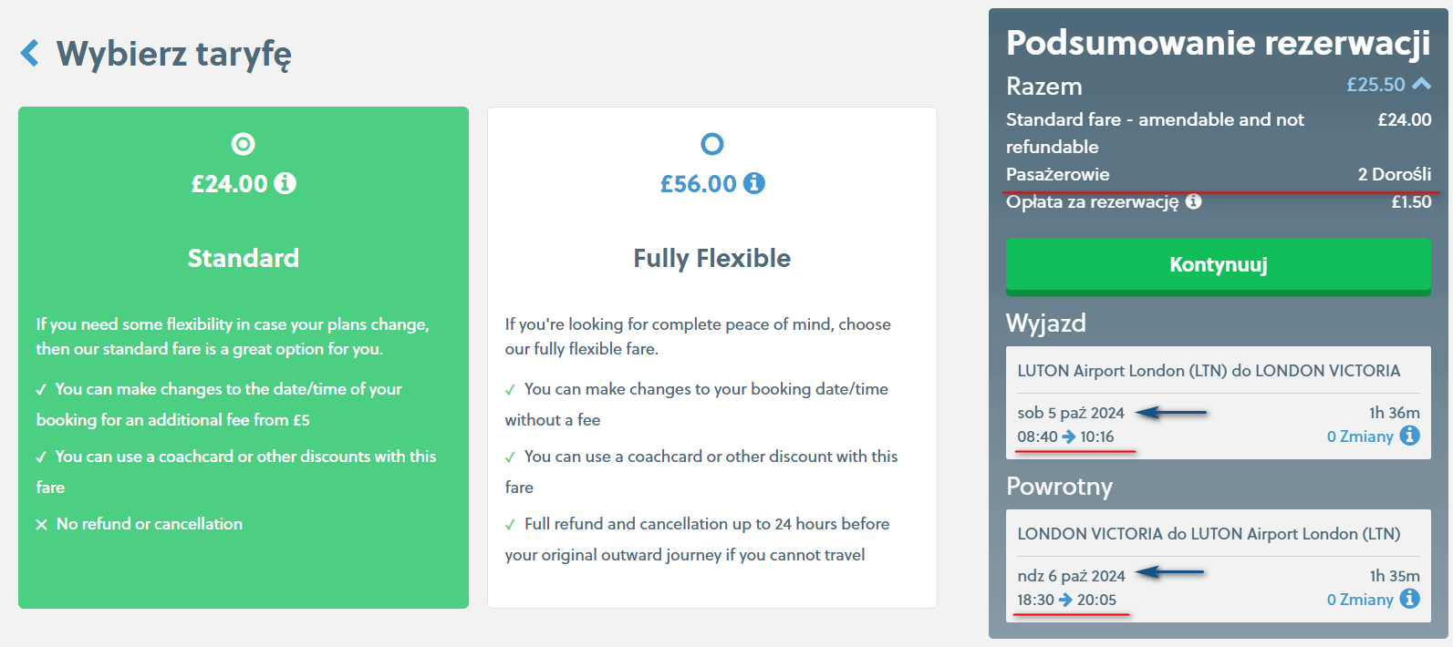 Jedną z najtańszą (na moment tworzenia oferty) opcją dojazdu z lotniska Luton do centrum Londynu (dworzec Victoria), jest przejazd autokarem firmy National Express Coaches. Za kurs w dwie strony zapłacisz 25.5 GBP/2 osoby (ok. 129 PLN). Bilety zarezerwujesz na stronie internetowej przewoźnika.