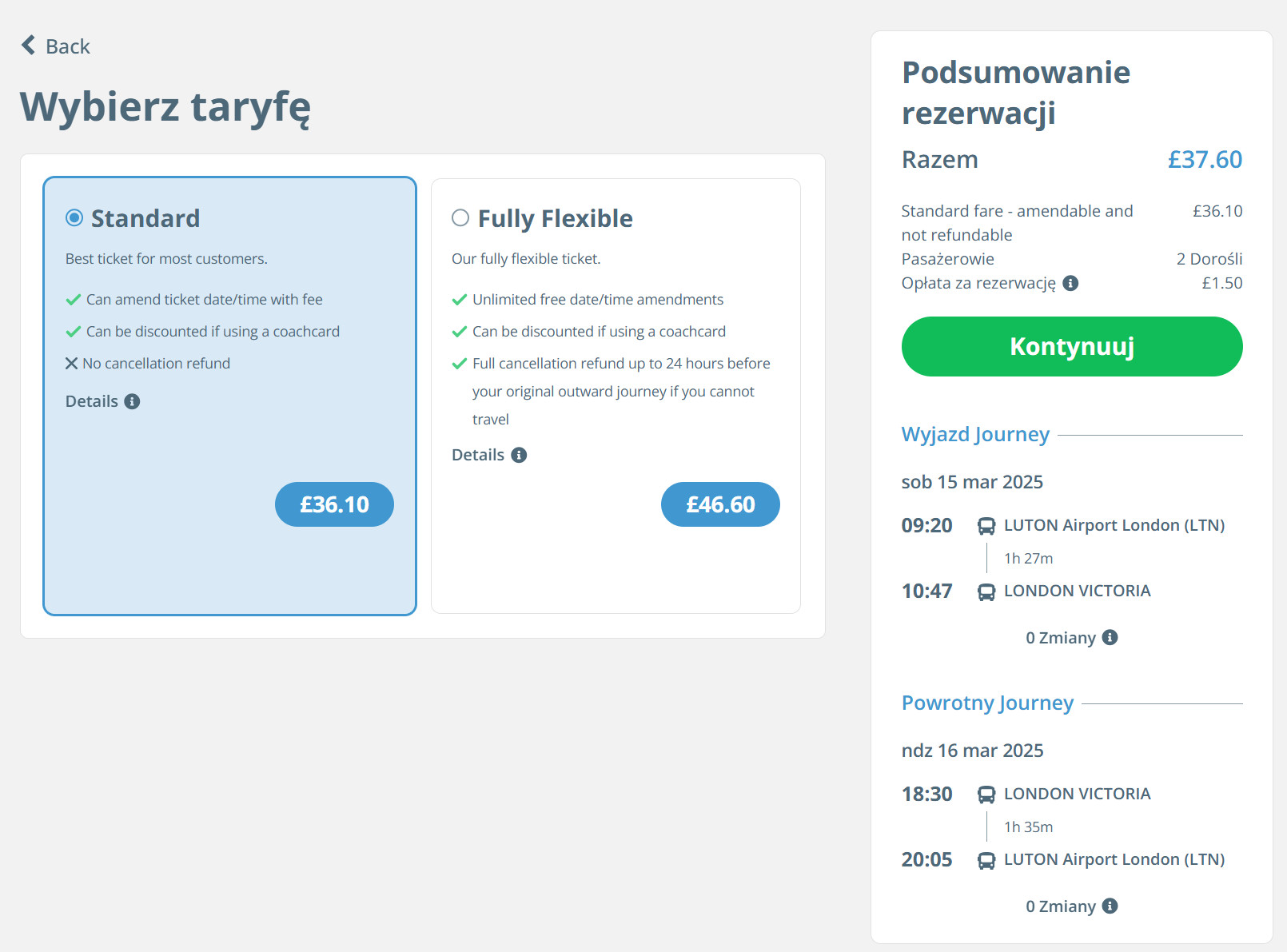 Jedną z najtańszych (na moment tworzenia oferty) opcji dojazdu z lotniska Luton do centrum Londynu (dworzec Victoria), jest przejazd autokarem firmy National Express Coaches. Za kurs w dwie strony zapłacisz 37,6 GBP/2 osoby (ok. 189 PLN). Bilety zarezerwujesz na stronie internetowej przewoźnika.