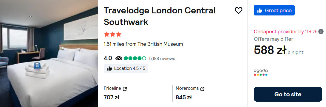 W Londynie zatrzymasz się w 3* hotelu Travelodge London Central Southwark, który znajduje się nieopodal stacji metra Southwark. Z lotniska (Londyn Luton) do centrum miasta (Victoria Coach Station) dojedziesz autobusem – szczegóły poniżej.