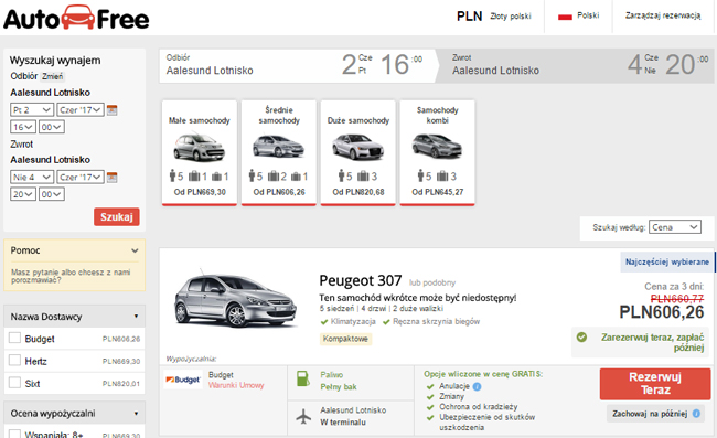 - Wypożyczenie auta za 606 PLN/4 osoby (151,50 PLN/osoba)