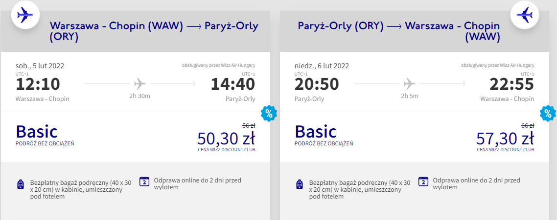 Na wycieczkę do stolicy Francji (lotnisko Orly) udacie się z warszawskiego lotniska, w terminie 5-6 lutego stycznia (sobota – niedziela). W tym okresie przypadają ferie zimowe, m.in. w województwie mazowieckim. W obie strony podróżować będziecie na pokładach samolotów linii Wizz Air z wliczonym małym bagażem podręcznym. Pamiętajcie, że w najniższej cenie polecą członkowie Wizz Discount Club, chętni na loty bez WDC zapłacą nieco więcej.