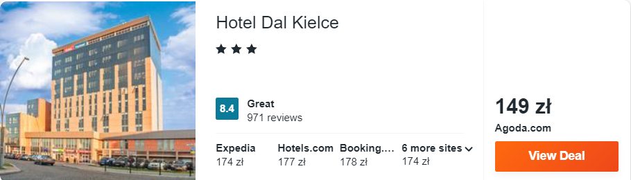 Przygotowane przeze mnie zestawienie otwiera 3* hotel Dal Kielce, który od rynku miejskiego oddalony jest o jedyne 270 metrów, a od kieleckiej Kadzielnii o nieco ponad 2 km – trasę tę pokonacie w niecałe 30 minut spacerem. Na miejscu goście zapewniony mają dostęp do bezpłatnego WiFi.