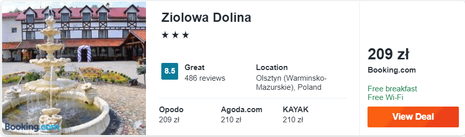 Na początek Mazury, gdzie proponuję wam pobyt w Ziołowej Dolinie. Położona jest ona nad brzegiem rzeki Łyna, a w cenie zakwaterowania zapewnione będziecie mieli codzienne śniadania, dostęp do sieci WiFi oraz miejsca parkingowe.