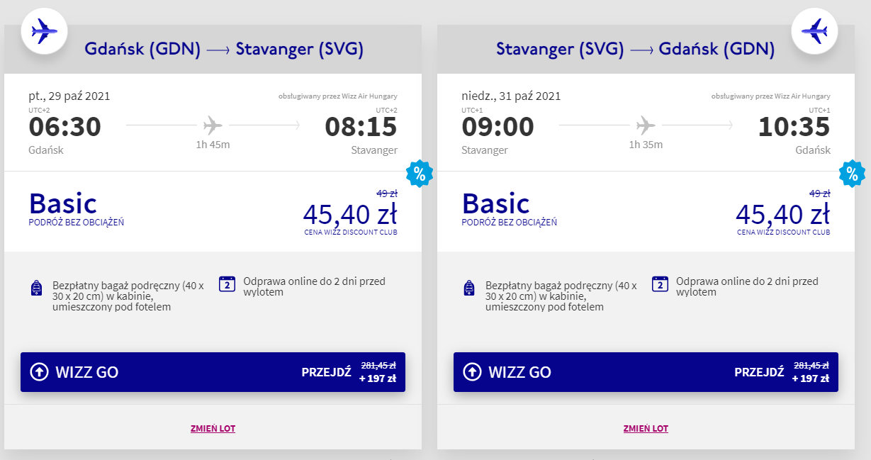 Do Norwegii polecicie na pokładzie samolotów linii lotniczych Wizz Air z lotniska w Gdańsku. Na wycieczkę wybierzecie się na weekend, w terminie 29 – 31 października (piątek – niedziela). Pamiętajcie, że najbardziej atrakcyjna cena dotyczy członków Wizz Discount Club. Bez dodatkowych kosztów udacie się wyłącznie z bagażem podręcznym. Przed wyjazdem warto przeczytać nasz poradnik, jak się spakować.