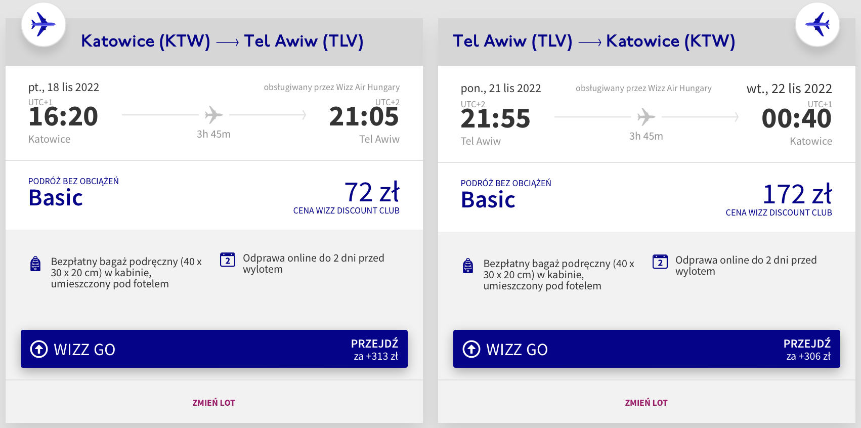 Do Tel Awiwu polecicie z lotniska w Pyrzowicach w terminie 18-21 listopada (piątek-poniedziałek), na pokładzie samolotów linii lotniczej Wizz Air. Pamiętajcie, że bilety w najniższej cenie dostępne są dla członków Wizz Discount Club. Chętni na loty bez WDC zapłacą nieco więcej.