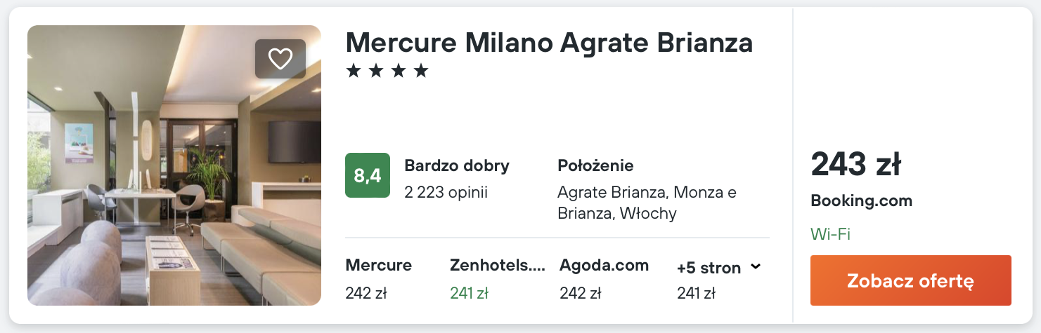 W Mediolanie polecam noclegi w 4* Mercure Milano Agrate Brianza, który oferuje klimatyzowane pokoje z WiFi, telewizorem i prywatną łazienką z bezpłatnym zestawem kosmetyków.
