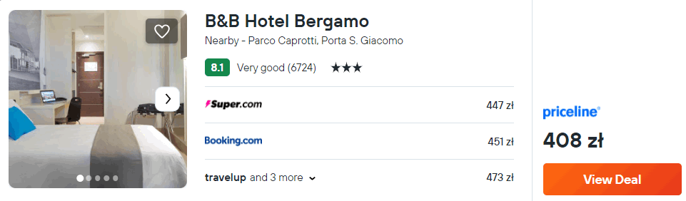 We Włoszech zatrzymasz się w 3* hotelu B&B Bergamo, który od dworca kolejowego oddalony jest o ok. 500 metrów. Z lotniska w okolice miejsca noclegowego dojedziesz autobusem. Za 24-godzinny bilet umożliwiający nielimitowane przejazdy w obrębie miasta Bergamo zapłacisz tylko 4.9 EUR.